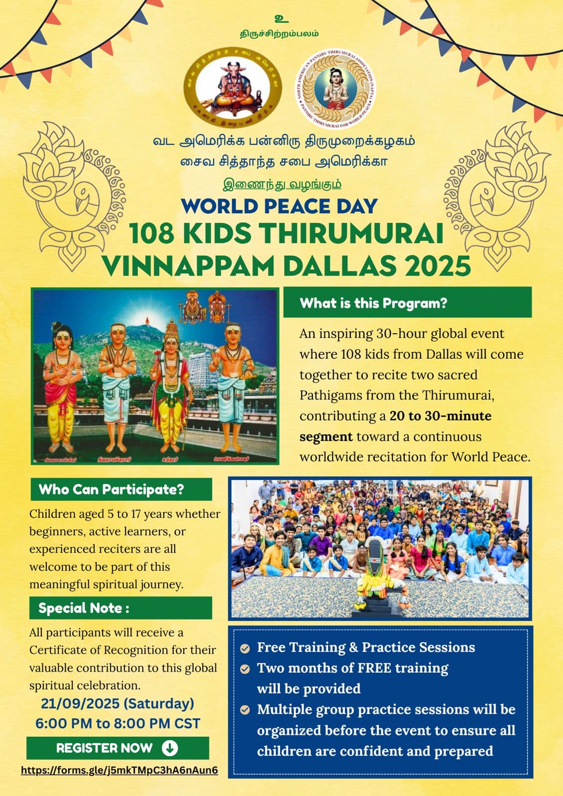 The 4th Annual 108 Kids Thirumurai Vinnappam will be held in Dallas, Texas, as part of the global 30-hour Thirumurai Recital for World Peace, in observance of the United Nations International Day of Peace (World Peace Day). This sacred initiative is led by the North America Panniru Thirumurai Association (NAPTA) in collaboration with Dallas Saiva Sabai.